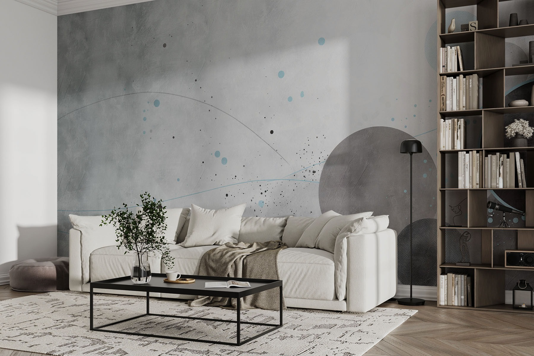 Entre num mundo de vibrações calmantes com este mural de parede que apresenta tons de cinzento e círculos azuis, acompanhados por linhas suaves que parecem dançar através da superfície. É como uma conversa entre cores, sussurrando segredos de serenidade e criatividade. Imagine-se a beber o seu café da manhã num recanto acolhedor, com os tons suaves a envolvê-lo como um abraço caloroso. Perfeito para uma estética moderna, este mural convida a devaneios e pensamentos profundos. Quer se trate da sala de estar ou de um espaço criativo, dá o tom certo – convidativo mas refrescantemente vibrante. Diga adeus às paredes aborrecidas e olá a um toque de inspiração!