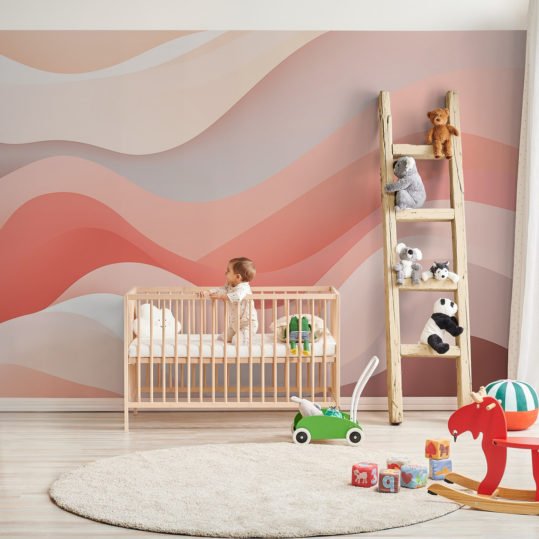 Este mural mistura sem esforço o calor e a elegância. Imagine-se a beber chá no seu canto favorito, rodeado por ondas suaves de blush e creme – pura felicidade, certo? É um cenário perfeito para fins-de-semana preguiçosos ou encontros vibrantes. Porquê contentar-se com uma parede vulgar quando pode ter uma tela que parece uma brisa suave? Transforme o seu espaço num refúgio de estilo com este design encantador.