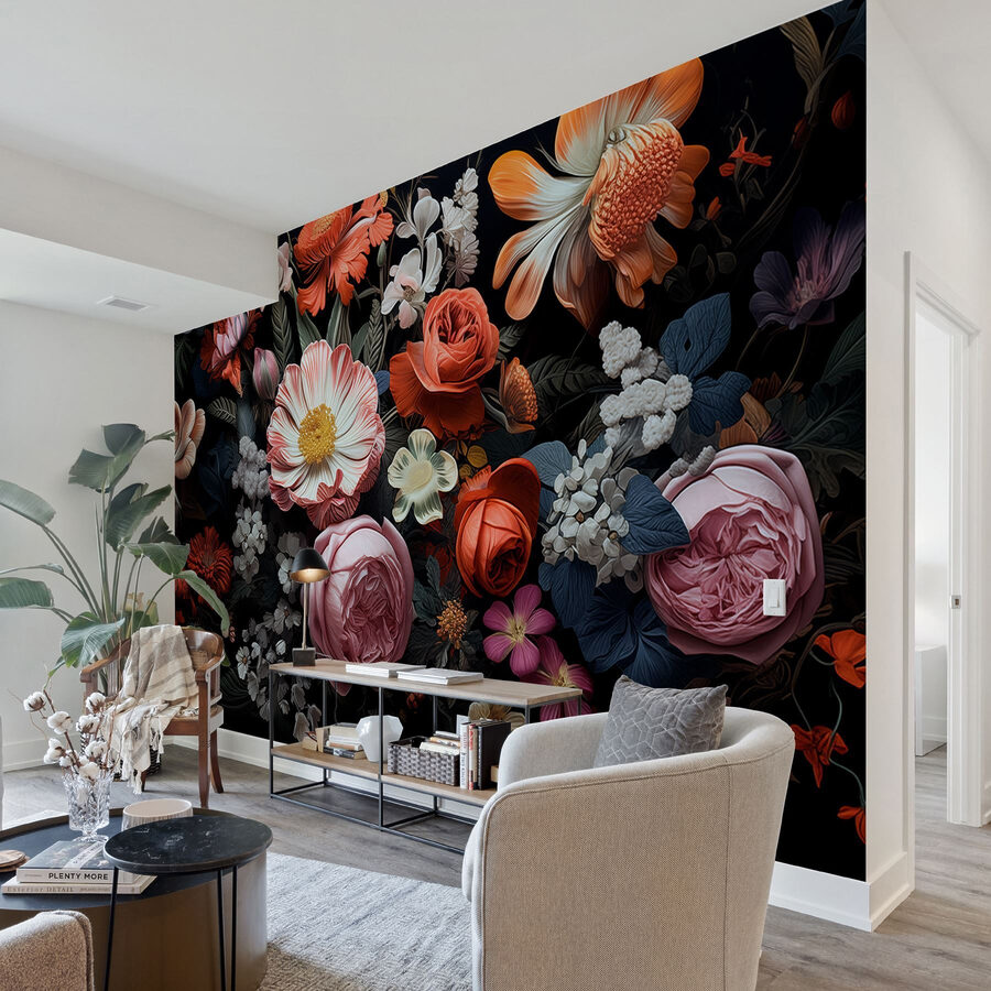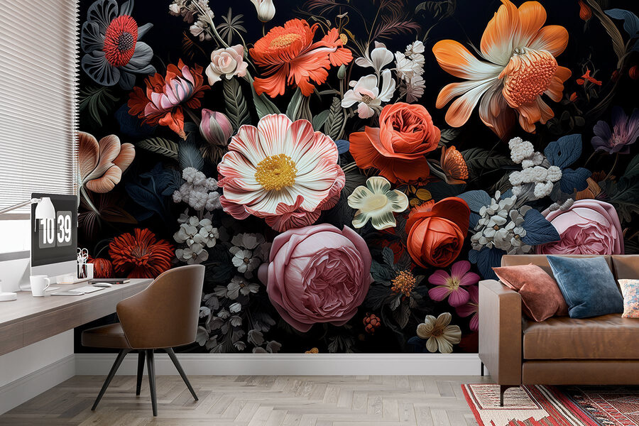 Transforme o seu espaço com este deslumbrante mural de parede, com um grupo vibrante de flores sobre um fundo preto arrojado. Imagine entrar numa sala onde a beleza da natureza parece irromper das paredes. Cada flor tem a sua própria história, pétalas vibrantes que sussurram segredos de um jardim em plena floração. Este mural convida ao calor e à vida em qualquer área – perfeito para uma sala de estar acolhedora ou um escritório elegante. Os convidados podem dar por si a olhar para ele e a perguntar onde fica o jardim. O que há de melhor do que um pouco de inspiração floral para despertar a alegria?