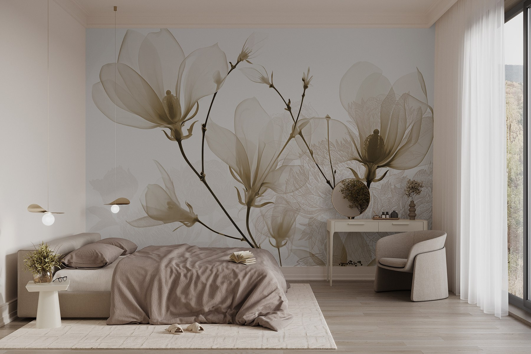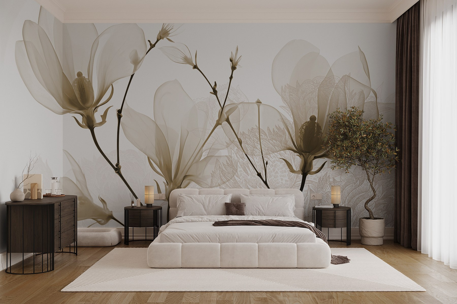 Transforme qualquer divisão num retiro tranquilo com este mural de flores delicadas em tons suaves. Imagine: acordar com suaves vibrações florais que sussurram serenidade, perfeitas para beber café ou exercitar as suas capacidades de leitura. As linhas subtis e os tons suaves criam um ar de sofisticação sem esforço. Os amigos vão ficar maravilhados com o facto de uma adição tão simples poder elevar todo o espaço. É quase como trazer um jardim para dentro de casa – sem o pólen incómodo! Quer seja num recanto acolhedor ou como peça de destaque, cria o ambiente ideal, não acha?