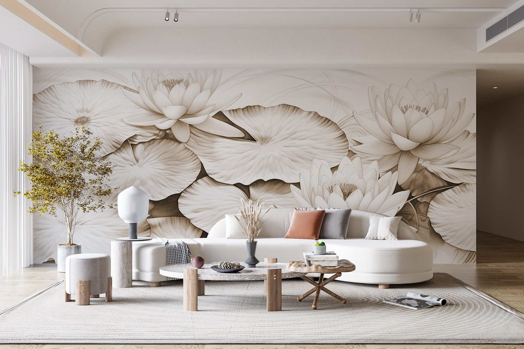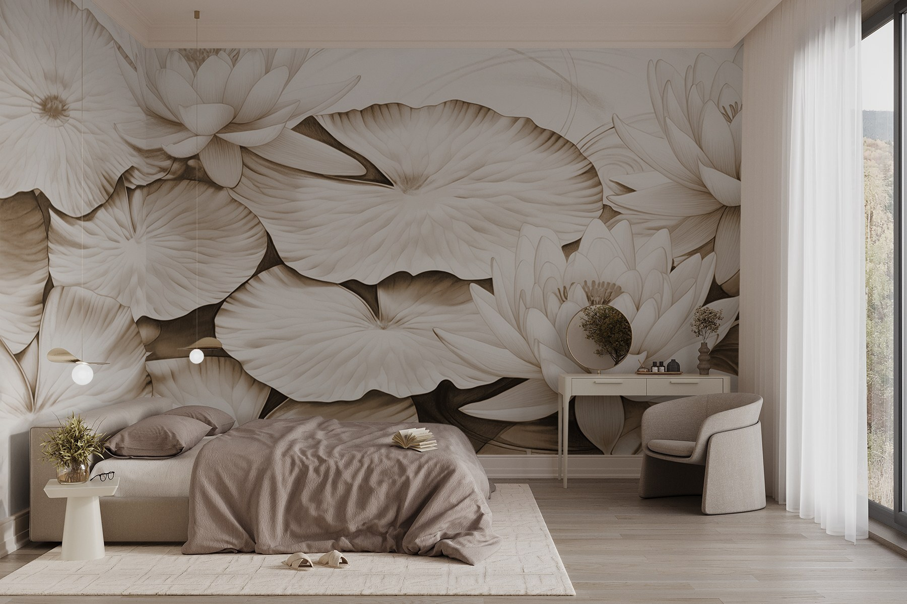 Transforme qualquer divisão com este mural encantador que apresenta delicados nenúfares e nenúfares requintados. Imagine entrar no seu espaço e sentir-se como se tivesse entrado num lago sereno, com reflexos suaves e ondas suaves. É como se a calma da natureza estivesse apenas a uma parede de distância. Perfeito para aqueles que anseiam por uma vibração tranquila, este mural traz uma fatia de paz – talvez até inspiração para um futuro sonho acordado. Subtil mas marcante, dança lindamente com a luz, evocando uma nostalgia acolhedora. Um início de conversa perfeito, ou simplesmente um pano de fundo pacífico para momentos tranquilos.