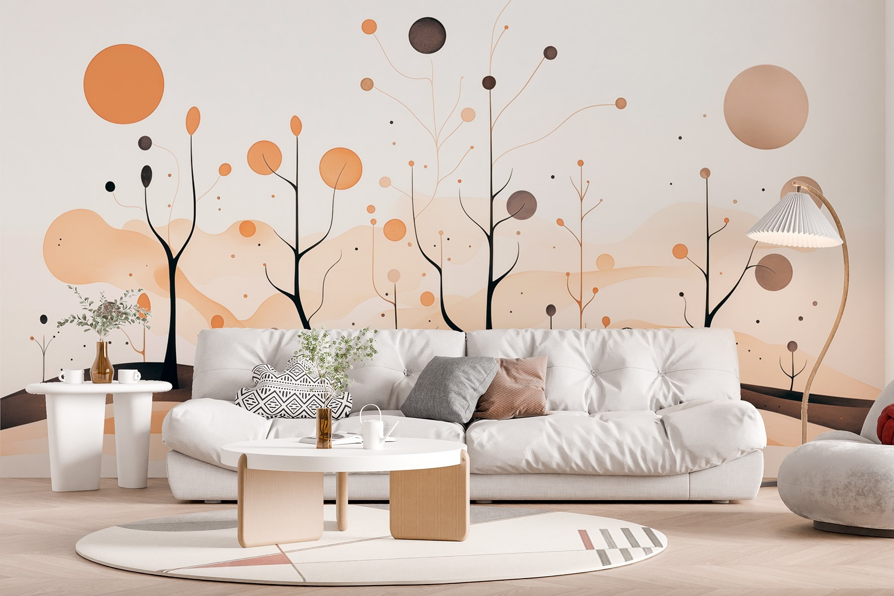 Transforme qualquer espaço num retiro sereno com este cativante mural de parede com árvores caprichosas e formas suaves e fluidas. Imagine entrar numa paisagem de sonho sempre que entra na divisão. As cores quentes de laranjas suaves e castanhos terrosos criam um ambiente acolhedor, perfeito para inspirar a criatividade ou simplesmente descontrair após um longo dia.