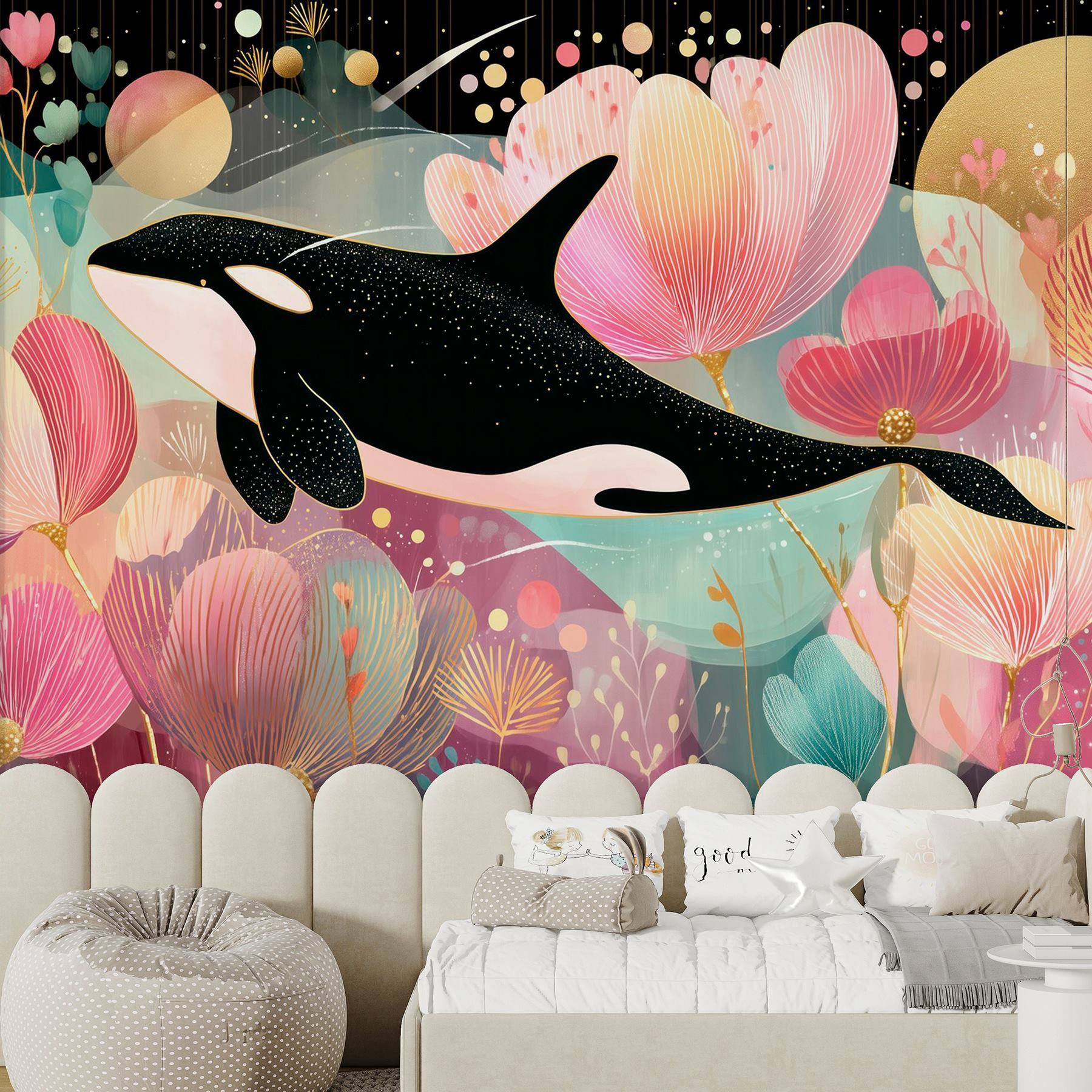 Mergulhe num mundo onde o oceano encontra o capricho! Este mural, que mostra uma magnífica baleia a deslizar por entre flores vibrantes, transforma qualquer divisão numa tranquila fuga subaquática. Imagine-se diante dele, sentindo o balanço suave da água e as tonalidades suaves a inundarem-no. É como ter um pedaço do mar na sua sala de estar, convidando à calma e à conversa. Os amigos podem parar a meio da conversa, hipnotizados pela arte encantadora e pelas cores de sonho. Perfeito para uma casa de praia ou apenas um toque de felicidade à beira-mar num recanto urbano, este mural promete iluminar qualquer parede – não é necessário equipamento de pesca.